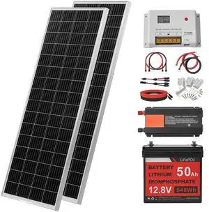 VVEVOR 200W 12V Complete Solar Power Kit, 2PCS 100W Monocrystalline Solar Panels + 12.8V 50Ah LiFePO Battery + 40A Charge Controller + 800W Power Inverter, Ideal for RV Home Camping Boat Off-Grid