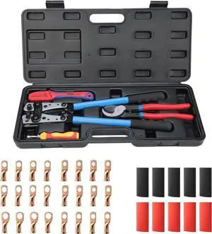 Cable Lug Crimping Tool Set, with 10pcs 1/0 AWG-3/8 Battery Lugs and 10pcs 3:1 Heat Shrink Tubing