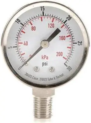 ZORO SELECT 4CFF6 Commercial Pressure Gauge, 0 to 30 psi, 2 in Dial, 1/4 in