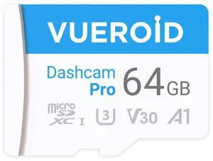 Vueroid 64GB Dashcam Pro microSD Card with Reader Adapter, C10, V30, UHS-I, Class 10, A1, High Speed Memory Card for 4K UHD Video, Read Speed up to 100 MB/s microsdxc