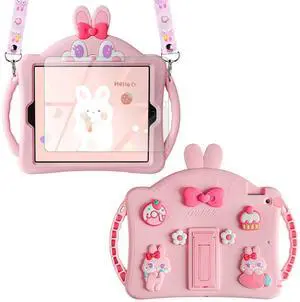 WESADN for iPad 9th Generation Case iPad 8th 7th Generation Cases 10.2 inch for Kids Girls with Screen Protector Shoulder Strap Kickstand Cute Rabbit Silicone Cover for iPad 10.2 Case Pink