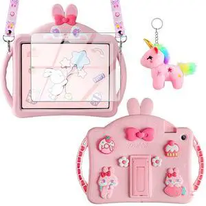 WESADN for iPad 9th Generation Case iPad 8th 7th Generation Cases 10.2 inch for Kids Girls with Screen Protector Shoulder Strap Kickstand Cute Rabbit Silicone Cover for iPad 10.2 Case Pink