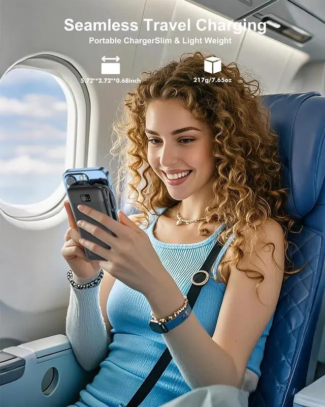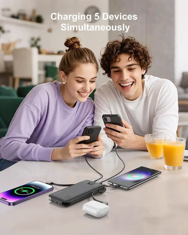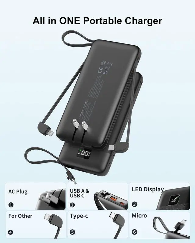 Power up your devices effortlessly with this versatile 10000mAh portable charger with built in cables and an AC wall plug. The power bank ultra-slim design measures just 5.76 x 2.72 x 0.68 inches and weighs only 8.11 ounces, making it perfect for travel. With 22.5W fast charging capability and 5 outputs, this portable phone charger can charge multiple devices simultaneously through its integrated USB-C and micro cables, plus additional USB ports. Portable charger for iphone clear LED display shows remaining battery levels at a glance, while the built-in wall plug eliminates the need for extra charging accessories. 10000mah Power bank for iPhone, iPad, Samsung, Google Pixel, tablets, and smaller USB devices like wireless earbuds, fitness trackers, and smartwatches. Advanced safety features include overcharge, overcurrent, and short-circuit protection through intelligent charging management. The sleek design combines portability with reliable performance, making the battery pack for iphone an essential companion for anyone needing dependable power on the go. The pro-grade lithium polymer battery ensures consistent charging performance while keeping your devices protected.