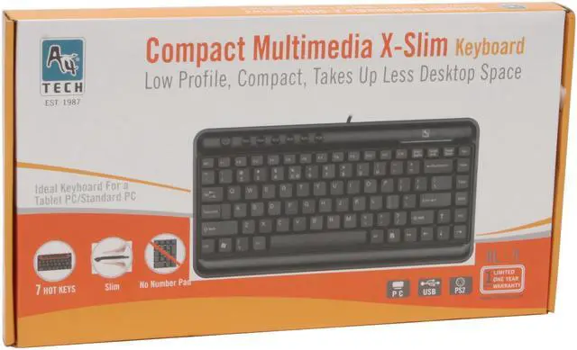 A4tech's X-Slim Multimedia Keyboard, space saver, low profile, and compact layout. 7 hot keys, slim profile, Laser inscribed keys with a Large enter" key.Compact slim profile, great for desktop or travel at just 1.5cm thickness and less than 2/3 the width and weight of traditional keyboard. 7 convenient hot keys : power, back, forward, refresh, home, search and email."Keyboard/Keypad Connectivity Technology: CableHot Keys: MultimediaHot Keys: Home PageHot Keys: RefreshHot Keys: PowerHot Keys: BackHot Keys: ForwardHot Keys: EmailKeyboard/Keypad Host Interface: USBColor: BlackKeyboard/Keypad Height: 0.57Keyboard/Keypad Width: 12.60"Keyboard/Keypad Depth: 6.30"Platform Supported: PCDevice Supported: Computer"