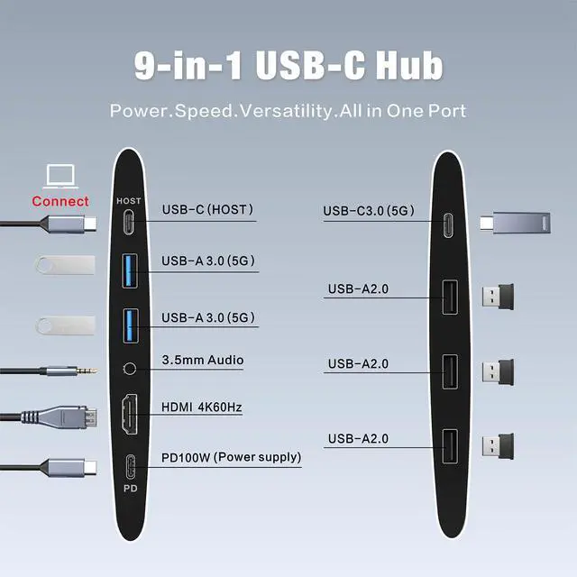 - [What is in the packaging box?]In the color box there is 1x laptop stand integrated with 9 ports USB-C Hub, 1x full-featured USB-C to USB-C cable (~19.7 inches long), 1x Instruction Manual