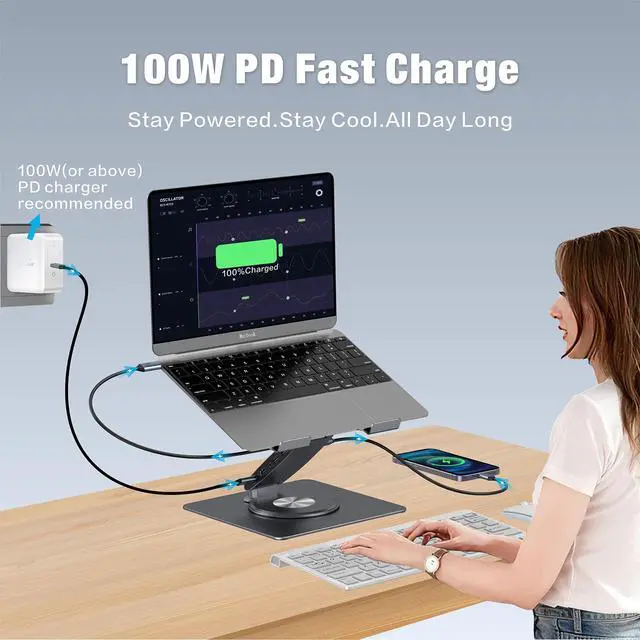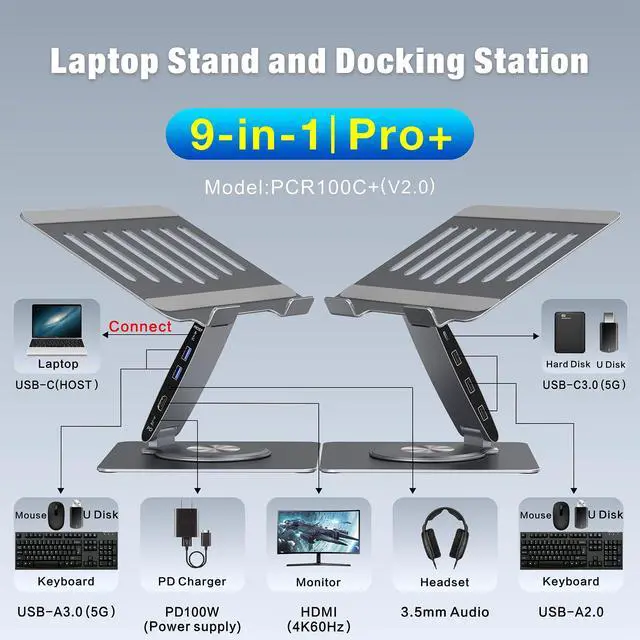 This device unites a laptop stand with a 9-in-1 dock to offer unparalleled ease and a superior user interface, while its durable aluminum build ensures lasting resilience; moreover, the 360-degree rotating foundation allows smooth presentation sharing, and the integrated hub broadens connectivity with diverse ports for peak productivity, all merging ergonomic elegance with functional brilliance to enhance collaborative workspace performance.