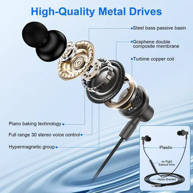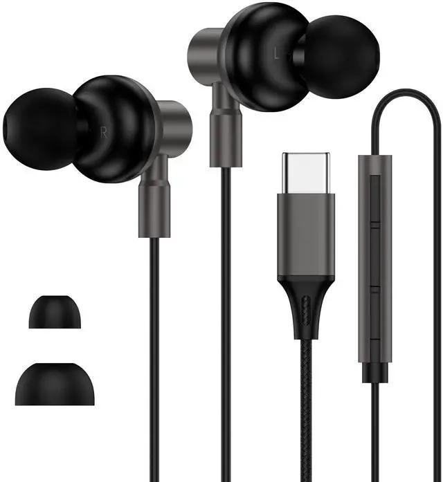 1. The wired headphones usb c feature a braided cable connecting the split interface to the USB-C port, while both earpiece cables are made of plastic.