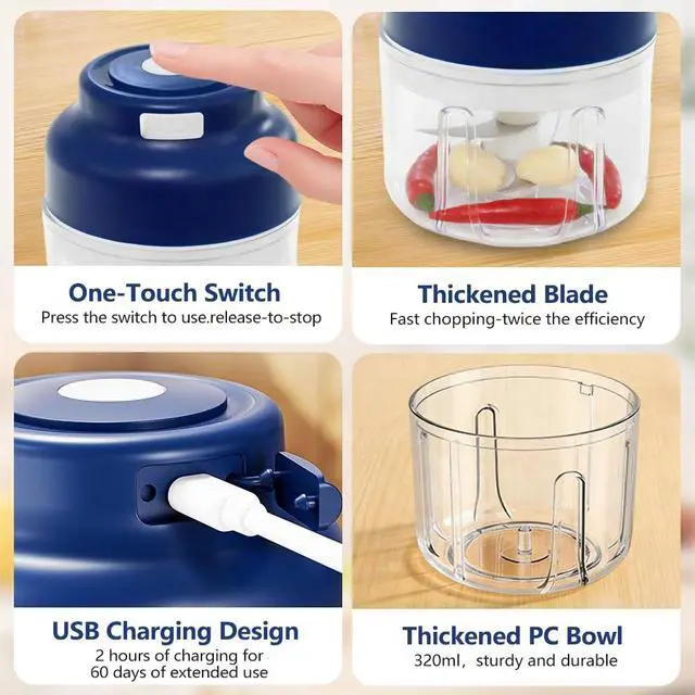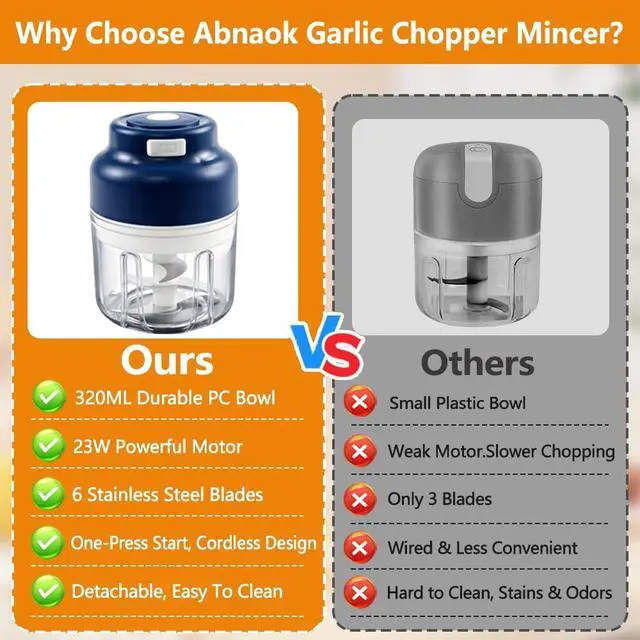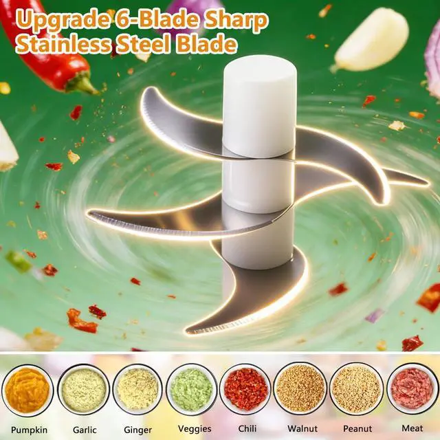 Upgraded Electric Garlic MincerThis food processor features a powerful 23W motor driving six 420 stainless steel blades to quickly and evenly chop a wide range of ingredientsfrom tough vegetables and nuts to meatmaking food prep fast and effortless.