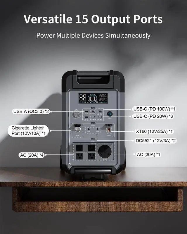 [Multiple Output Ports] Equipped with 15 output ports, the 3600W portable power station can charge and power a wide range of devices simultaneously. The ports include: 1 x AC (30A), 4 x AC (20A), 2 x USB-A (QC3.0), 3 x USB-C (PD 20W), 1 x USB-C (PD 100W), 2 x DC5521 (12V/3A), 1 x XT60 (12V/25A), 1 x Cigarette Lighter Port (12V/10A)