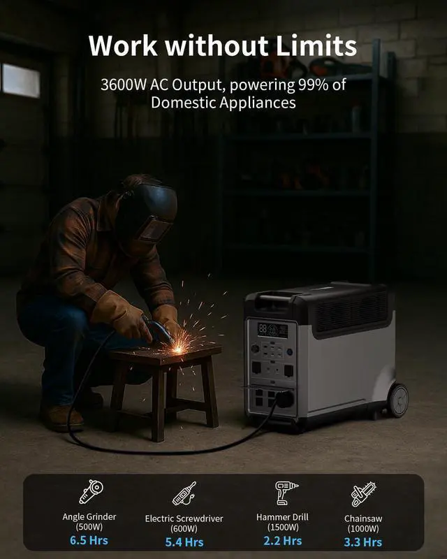 [Ideal for Outdoors & Emergencies] Perfect for camping, RV trips, outdoor activities, and emergency power backup, the 3600W portable power station provides reliable energy wherever you need it. It's your trusted companion for powering lights, devices, small appliances, and more, making the power station an essential tool for adventure or power outage.