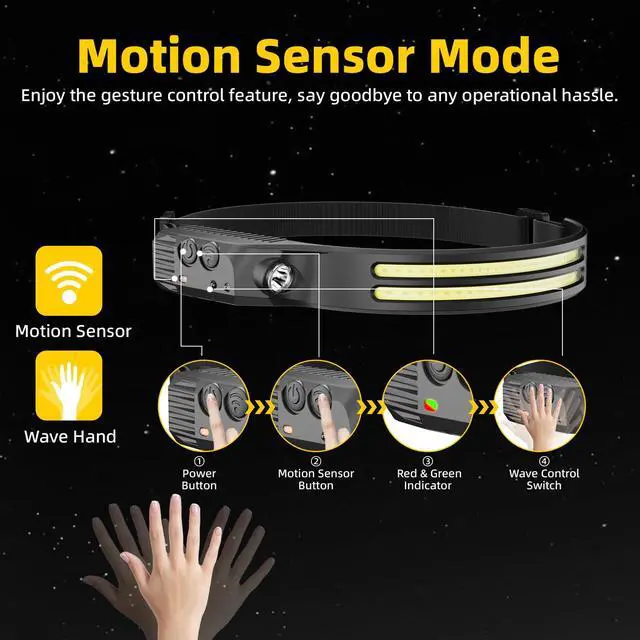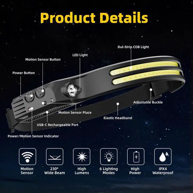 Our headlamp offers a secure and comfortable lighting experience. The 230° wide-beam illumination range offers comprehensive coverage, elevating your outdoor activities' safety and convenience, allowing you to explore with confidence.