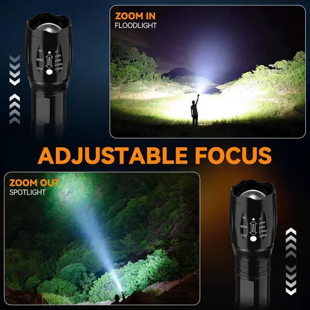 • Adjustable Focus - Adjustable focus for use in different situations (just rotate the flashlight head to adjust). The LED flashlight allows you to select focus between spot and flood beams.