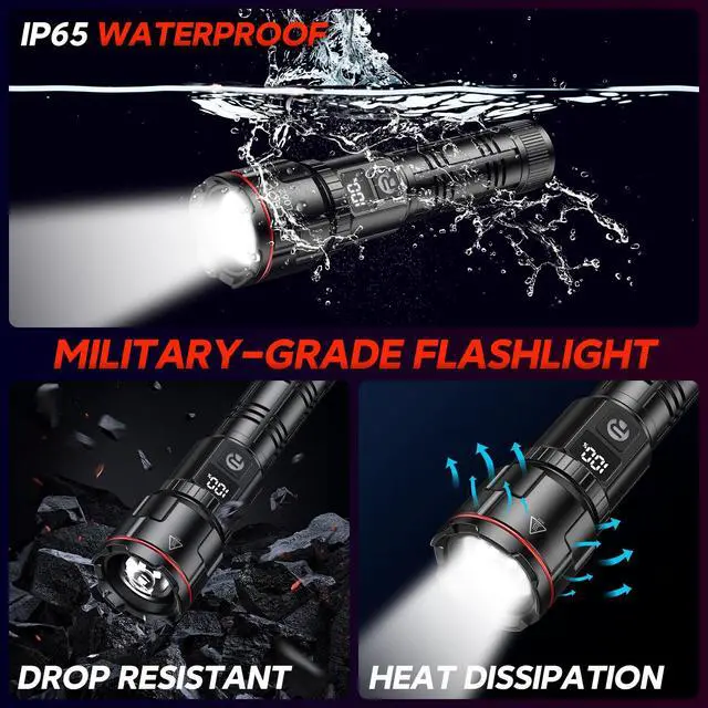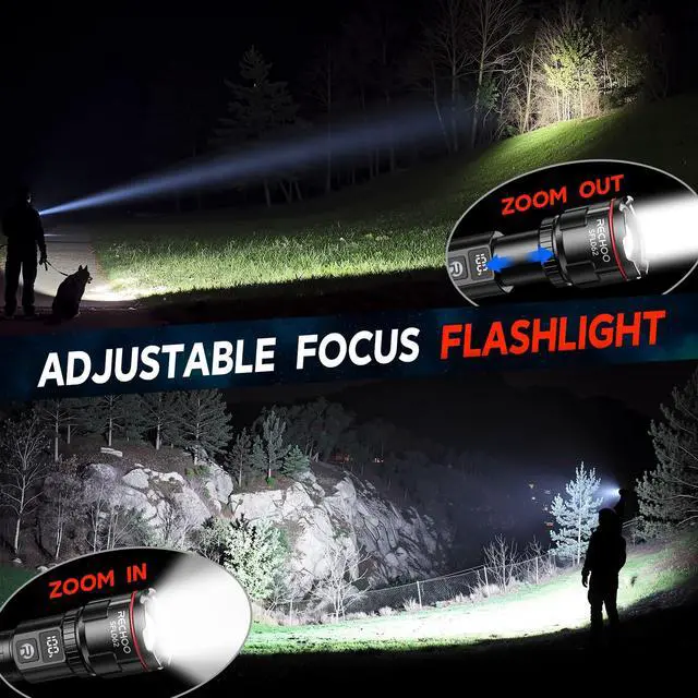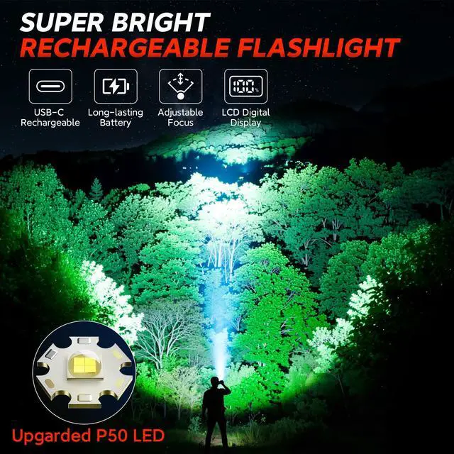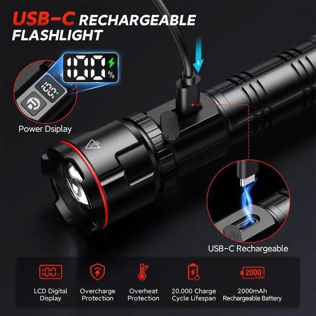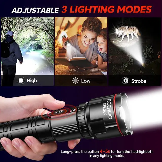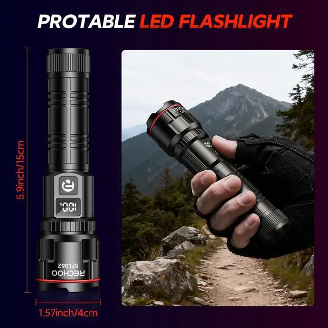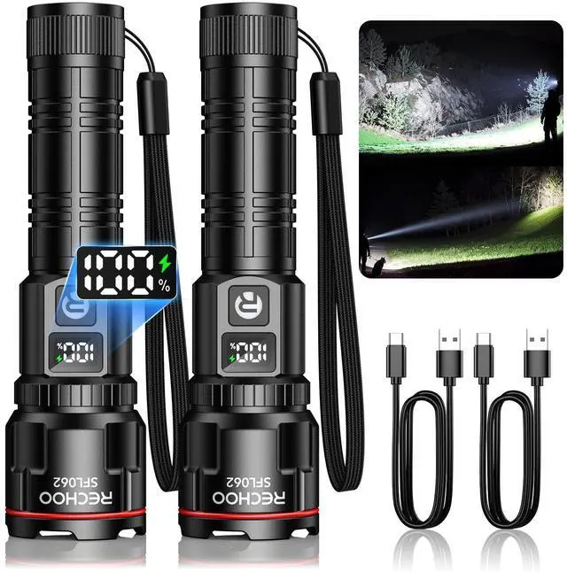 RECHOO High Lumens Rechargeable Flashlight with P50 LED & LCD Display Powerful Illumination with Smart LCD Display: Experience superior brightness with our upgraded P50 LED chip, delivering a super-focused beam up to 328 feet. The standout feature is the clear LCD digital display showing real-time battery statusnever get caught off guard by unexpected power loss again. USB-C Fast Charging: Say goodbye to long charging times. Equipped with a high-speed USB-C port, this rechargeable flashlight charges twice as fast as ordinary models, reaching full power in just 3-3.5 hours. The robust port design and smart protection circuit ensure safe, long-lasting performance for everyday carry and all your adventures.3 Modes & Zoomable Versatility: Adapt to any situation with three lighting modes (High/Low/Strobe). Simply adjust the zoomable head to switch between wide floodlight and focused spotlightperfect for camping, hiking, dog walking, and emergency use. Built to Last: Constructed from high-quality aluminum alloy with IP65 water resistance, this rugged flashlight withstands 2-meter drops, harsh weather, and daily wear. Rain or shine, it delivers reliable performance when you need it most. Complete Package & Great Gift: Includes 1 rechargeable flashlight, 1 rechargeable battery, 1 charging cable, and 1 user manual. An ideal Christmas gift for fathers, mothers, and friends. Note: Please fully charge before first use for optimal performance. Light up your world with confidencechoose RECHOO.