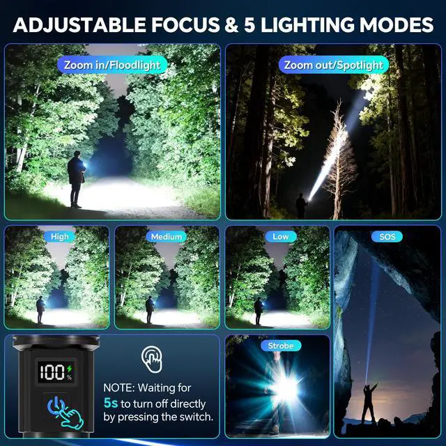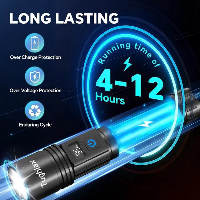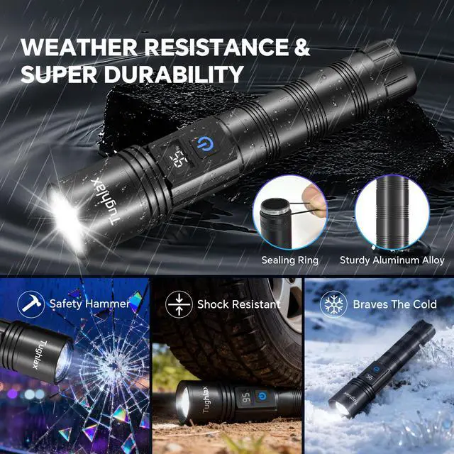 Upgrade your lighting experience with our high-lumen rechargeable flashlights, designed for power, durability, and versatility. Equipped with an upgraded LED chip, these flashlights deliver an astonishing high lumensbright enough to illuminate objects up to long meters away or light up an entire room or backyard with easeKey Features: Long-Lasting & Fast Rechargeable. Built-in high-capacity battery provides up to 12 hours of runtime. USB-C fast charging (4-6 hours for full charge, 50% faster than standard flashlights). LCD digital power display lets you monitor battery life at a glance. 5 Lighting Modes & Adjustable Focus:High / Medium / Low / Strobe / SOS adapt to any situation. Zoomable focus adjust the beam from wide floodlight to long-distance spotlight instantly. Rugged & Waterproof Design, made from aircraft-grade aluminum alloy for extreme durability. Waterproof & Shockproof performs flawlessly in rain, snow, or storms. Perfect for camping, hiking, fishing, power outages, car repairs, and more.