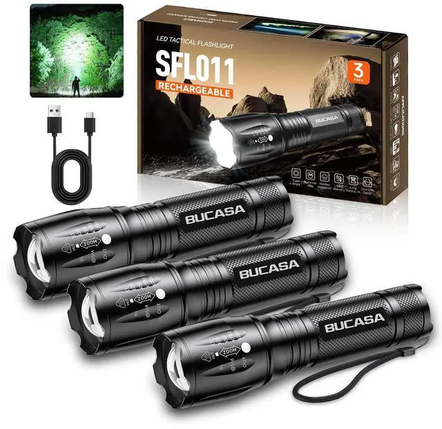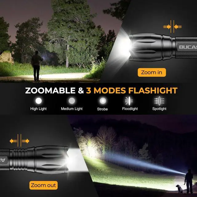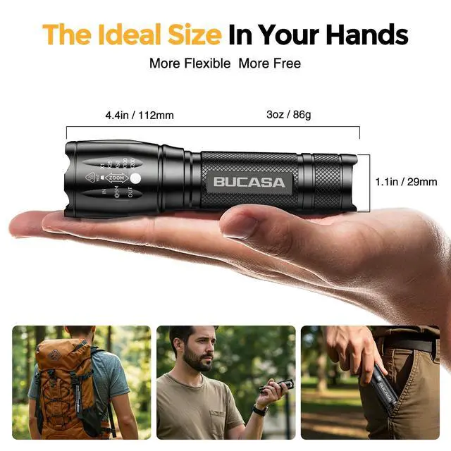 BUCASA flashlight features ??splash-proof protection??, standing strong against ??rain showers, water splashes, and harsh outdoor conditions??. Its ??sealed construction?? effectively repels moisture, ensuring reliable performance during ??camping, hiking, fishing trips, or emergencies??.