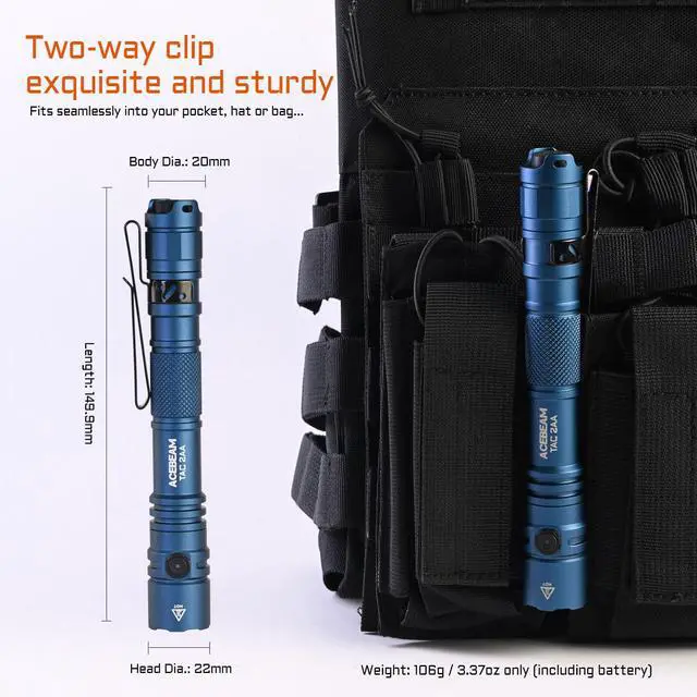 TAC 2AA edc flashlight with two-way clip, exquisite and sturdy, fits seamlessly into your pocket, bag or clip on your hat