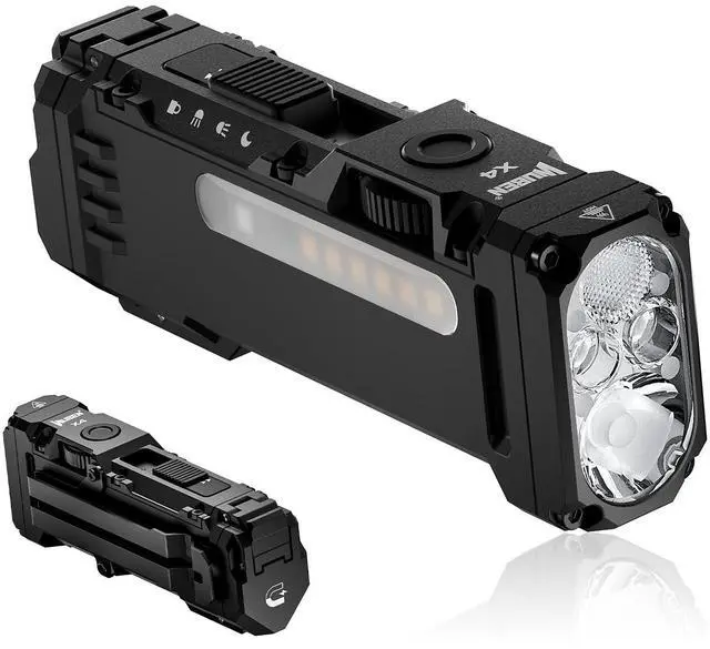 Portable Multi-functional Flashlight: WUBEN X4 small flashlight features a dual light source design, with the main light providing up to 1500 lumens of brightness and a beam distance of up to 205 meters. The side light provides warm light with up to 1 to 100 lumens and has an RGB light source
