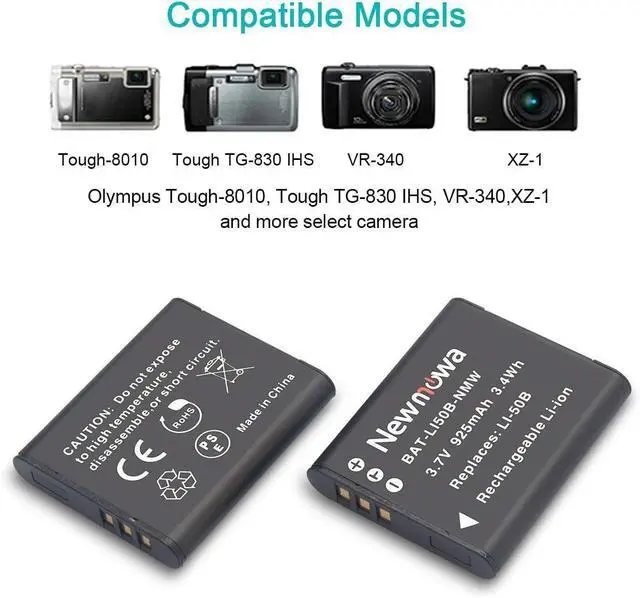 | Replacement for | Olympus Li-42B | Olympus Li-90B | Olympus BLH-1 | Olympus BLN-1 | Olympus BLS-1 | Olympus BLS-1 |