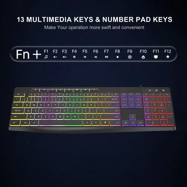 - Full Size 104 Keys,Additional 13 Multimedia Hotkeys --This full-sized wired keyboard has 13 multimedia hotkeys for easy instant access to your music, mail, computer, favorites ect. It brings convenience to your work and entertainment. There are number lock, caps lock and power indicators in the upper right corner of the keyboard to indicate the working status. Some multimedia functions are not available with Mac OS