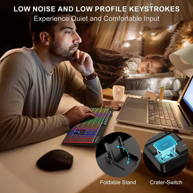 - Quiet Typing Feel,Ergonomic and Comfortable -- This quiet keyboard features a noise reduction design, making it extremely quiet when the keys are operated, allowing you to use it in a silent office or late at night, you don't need to worry about disturbing other people around you.The USB keyboard angle is adjustable with foldable stands, supporting your hands in a more ergonomic gesture to relieve fatigue and ensure comfortable typing experience. The operation is smoother, more suitable for finger pressing, and enjoys faster input speed.