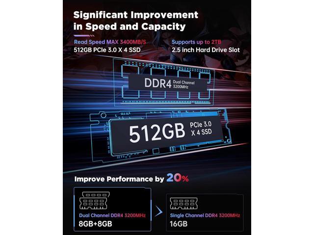 - Mini PC AD08 i7-11700B is equipped with 16GB DDR4 memory (dual-channel) and 512GB of M.2 NVMe PCIe3.0 SSD . The DDR4-3200MHz + PCIe 3.0 SSD combination ensures fast data access and smooth multitasking.1 x 2.5 "SATA HDD/SSD slots, expandable up to 2TB.