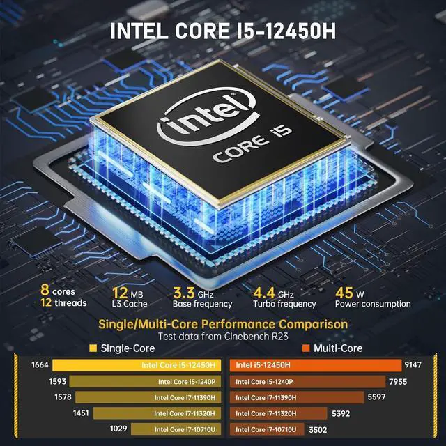 The AD15 Mini PC is equipped with Intel's 12th-gen Core i5-12450H processor, Mini PC featuring 8 cores and 12 threads. It delivers exceptional computing speeds, ranging up to to 4.40GH z. capable of easily handling spreadsheets, email, coding applications, web browsing, photo/video editing, light gaming, Whether for work or entertainment, it promises an extraordinary experience.