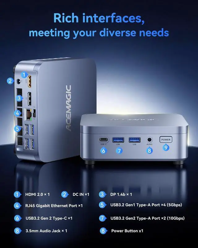Ports: 2×USB3.2 Gen2 Type-A, 4×USB3.2 Gen1 Type-A, USB3.2 Gen2 Type-C, HDMI 2.0, DP1.4b, 1000Mbps LAN, 3.5mm Audio Jack, DC IN, Power Button