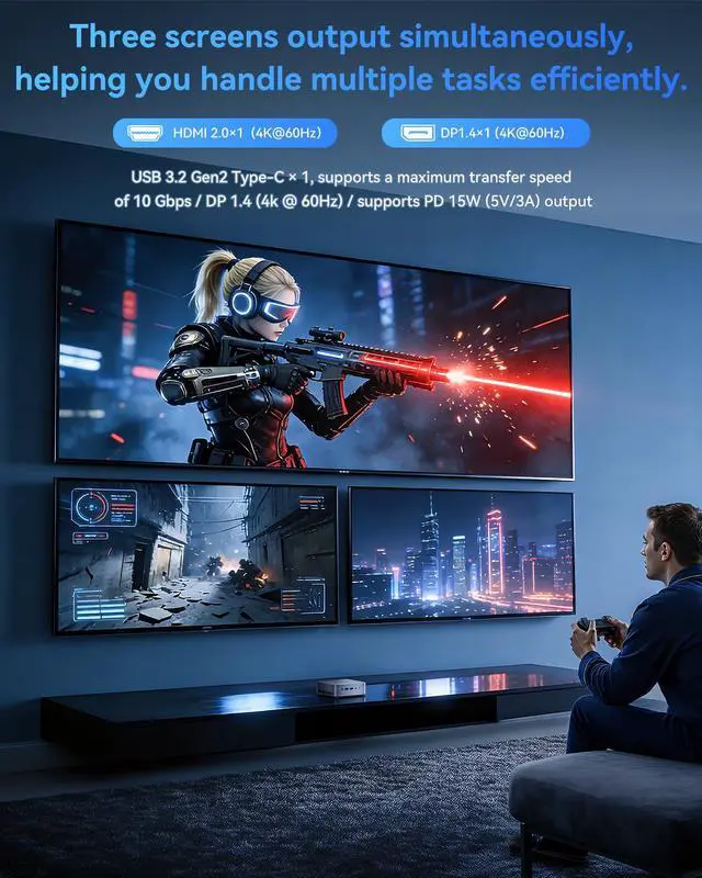 2. 3-Screen 4K Display & Fast Connectivity: Equipped with HDMI 2.0, DP1.4b and full-featured Type-C, it supports 3-screen 4K@60Hz output for efficient multi-monitor work; WiFi 6E offers faster wireless speeds and lower latency with 6-GHz band support, plus Gigabit LAN for stable wired connections.