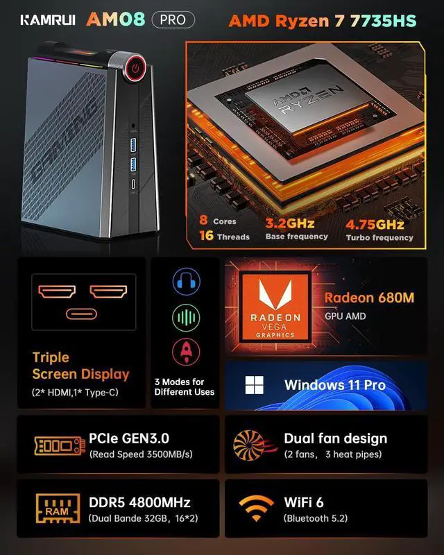 AUTO Mode (30-40W): Being an APU, it has RDNA 2-based Radeon 680M iGPU, which comes with 12 CUs that utilize system memory for graphics. One important aspect of these Zen 3+ APUs is that they are paired with DDR5 RAM to improve system performance. Enhanced storage capabilities, streamlined data management, and quick boot-up times. AM08PRO pc mini was designed for builders and developers to unleash their creativity.