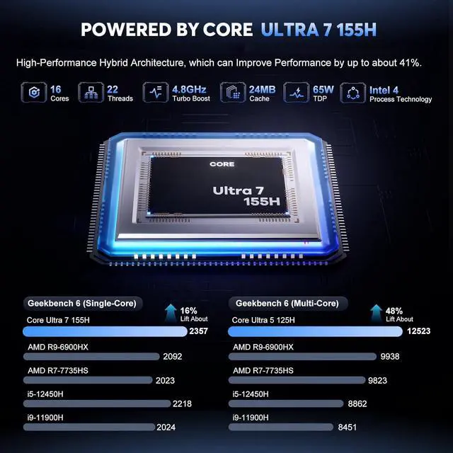 AI MINI PC Intel Core Ultra 7 155H Processor is the First-Generation Core Ultra Processors based on the Meteor Lake Architecture, harness advanced Intel 4 manufacturing processes and groundbreaking 3D high-performance hybrid architecture that significantly boosts computational efficiency. This processor boasts formidable multi-core performance with 6 P-Cores, 8 E-Cores, 2 LPE Cores optimized for lightweight tasks, 16C/22T 24MB, robust support for compute applications.