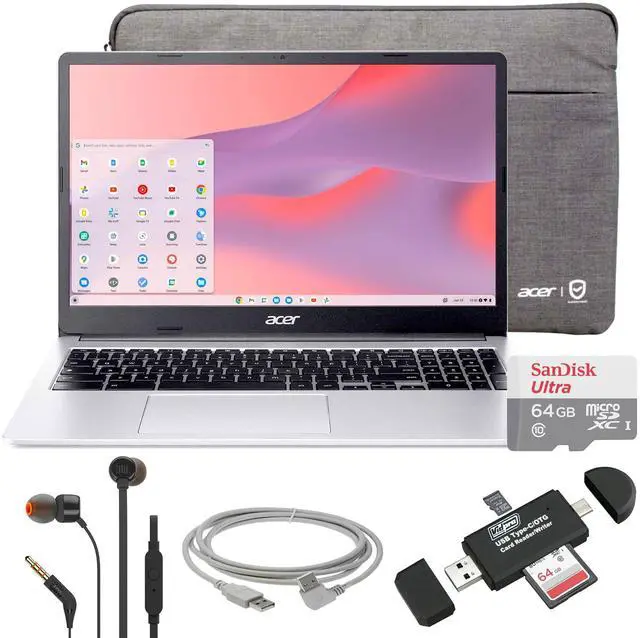 ACER CHROMEBOOK 315 15.6 INCH LAPTOP INTEL PROCESSOR N4500 4GB RAM 64GB EMMC PURE SILVER + JBL T110 IN EAR HEADPHONES + 10FT TYPE A MALE TO B MALE CABLE + 64GB MICROSDXC MEMORY CARD + MEMORY CARD READER Acer Chromebook 315 15.6 inch Laptop Intel Processor N4500 4GB RAM 64GB eMMC Pure Silver The Acer Chromebook 315 features a 15.6" anti-glare screen designed to let you get more done, no matter where you are. You'll stay focused in either the classroom or the office with a dedicated number pad, a fast processor, and an ecofriendly OceanGlass touchpad. Recognized as the perfect multi-media companion, this special machine is super thin, extra light and delivers unmatched value in todays fast-paced, technology-driven world. It features an impressive HDR camera, fast wireless connectivity and long-lasting battery life, so you can run your favorite Google apps or access your photos, videos, music and documentsall day long.