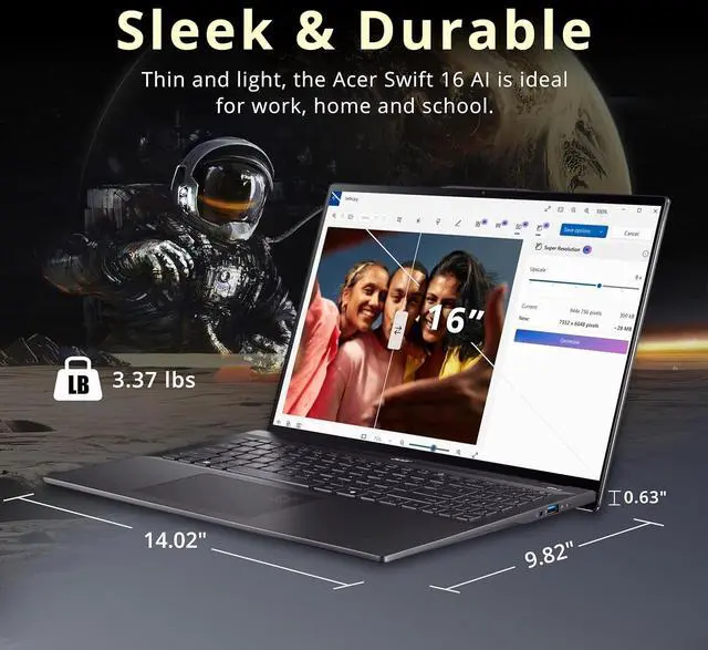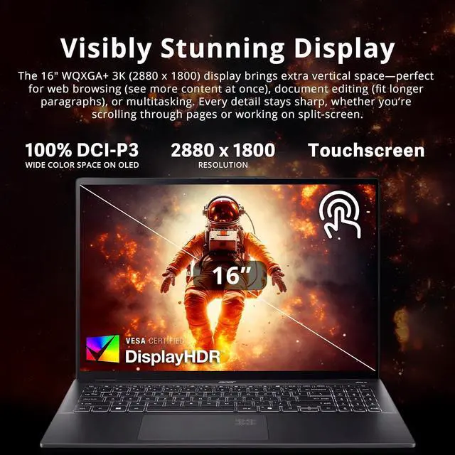 The Acer Swift 16 AI features a 16" WQXGA+ 3K OLED touchscreen, Intel Ultra 7 256V processor, 16GB RAM, and Intel Arc graphics for smooth performance. With a backlit keyboard and numeric pad, it combines productivity, creativity, and immersive visuals in a sleek design.