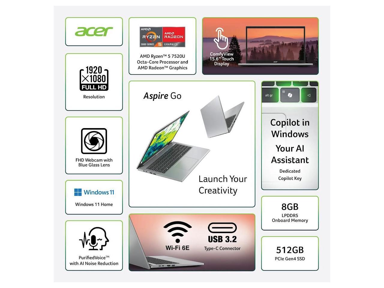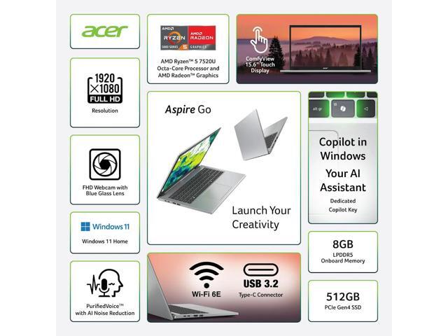 Acer Aspire Go 15.6" FHD IPS Touch Screen Laptop, AMD Ryzen 5 7520U (>Core i5-1235U), 8GB LPDDR5 / 512GB NVMe SSD, Wi-Fi 6E, HDMI 2.1, Win11 Home