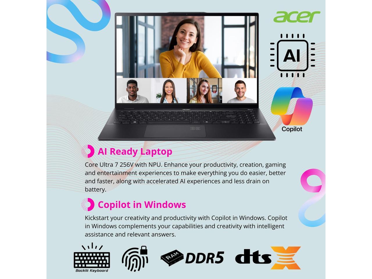[Processor]: Meet the Acer Swift 16 AI Laptop, a sleek AI-powered laptop designed for smart users. Power through any task with a blazing-fast Intel Core Ultra 7 256V Processor, 8 cores, up to 4.8GHz speed.