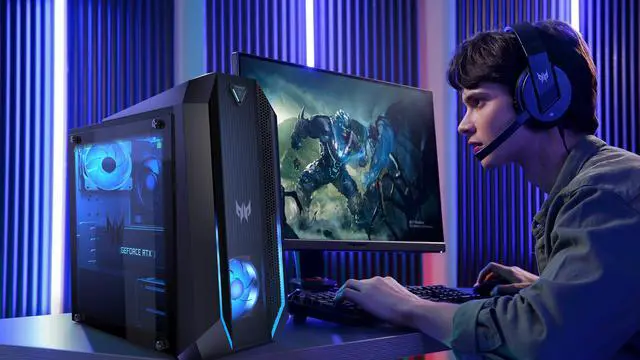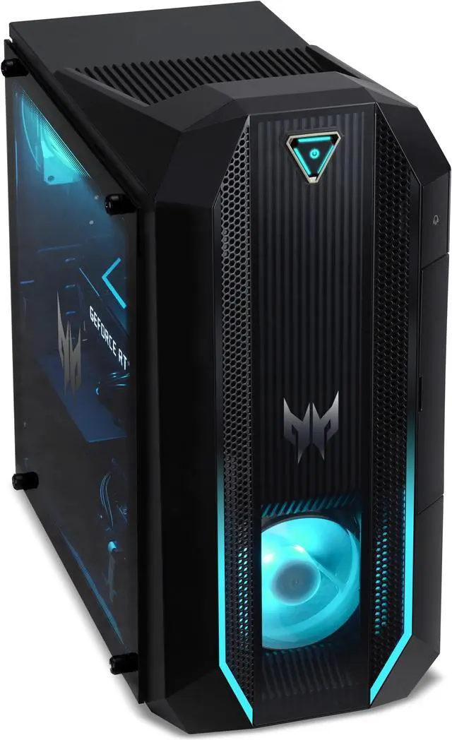 With its Intel Core i9-11900K processor and DDR4 RAM, the Predator Orion 3000 Desktop easily handles various games/software and delivers a smooth multi-tasking experience. Thanks to its SSD, the Orion 3000 Gaming Desktop offers quick file access, short start-up times, and ample storage capacity for your games, multimedia content, and applications. Equipped with an RTX 3070 video card (8GB video RAM), the Predator Orion 3000 Gaming Desktop delivers crisp and detailed in-game visuals whenever you're playing your favourite games. Featuring 2 USB 3.2 Gen 2 ports and convenient audio jacks, this Predator Gaming Desktops front port setup lets you easily connect various USB-enabled accessories without having to reach behind your PC.