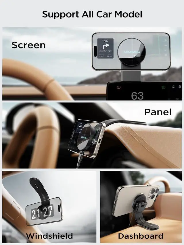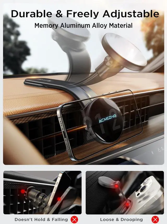 Bend It Your Way, Memory Alloy Mount: Our Magnetic Phone holder for car is made from aerospace-grade memory aluminium alloy, offering 360° flexibility. It fits any car model and position, standing, lying down, folding, and switching between portrait and landscape modes, to provide the best driving view. The high-quality material body not only boasts a sleek appearance but also features a robust structure, capable of withstanding thousands of bends without leaving a mark. Built to stay sleek and reliable, bend after bend.