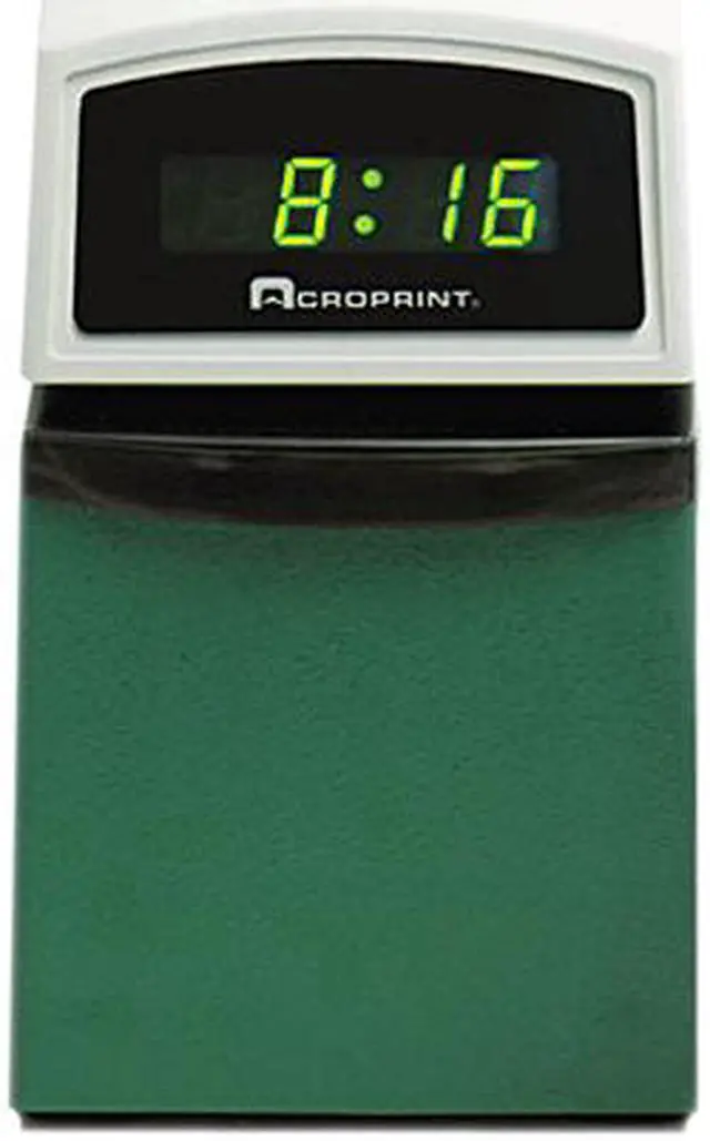 Heavy-duty Electric Time Stamp offers a digital time display and provides a record of year, month, date and time. Design accepts documents up to 1/4" thick. Electronically controlled printing provides clean, instant registrations. Precision wheels penetrate multiple copies. Auto ribbon reverse assures long ribbon life. Sturdy, durable design withstands thousands of registrations per day.