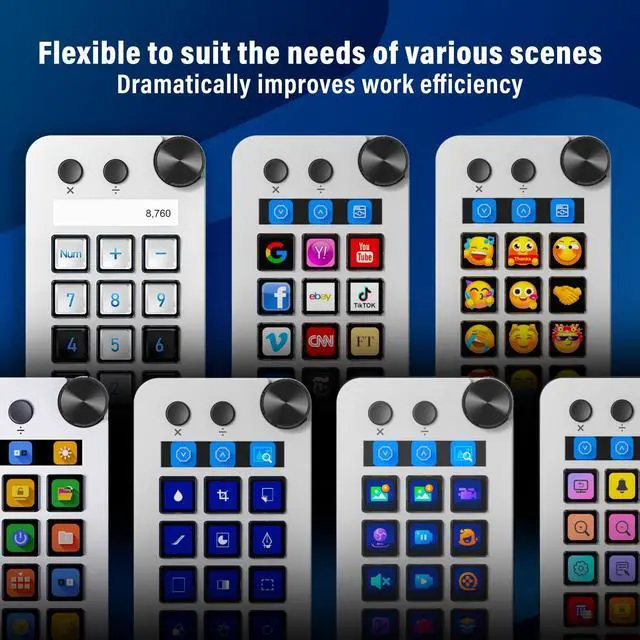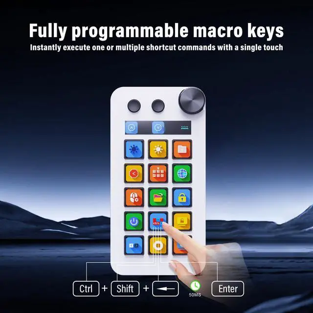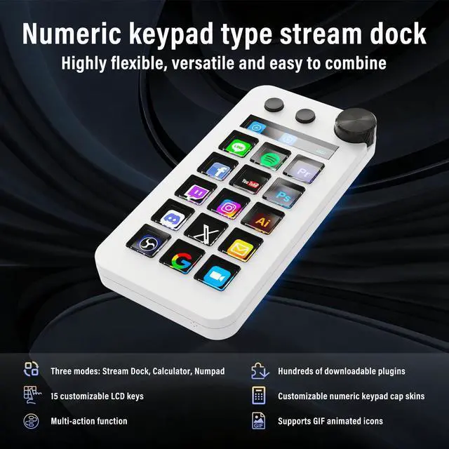 | Special Feature | Customizable LCD Bar, Large Dial, Programmable keyboard with 15 Customizable Macro Keys, Support GIF dynamic icon, Three Modes (Shortcut Keys, Calculator, and Numeric Keypad) |