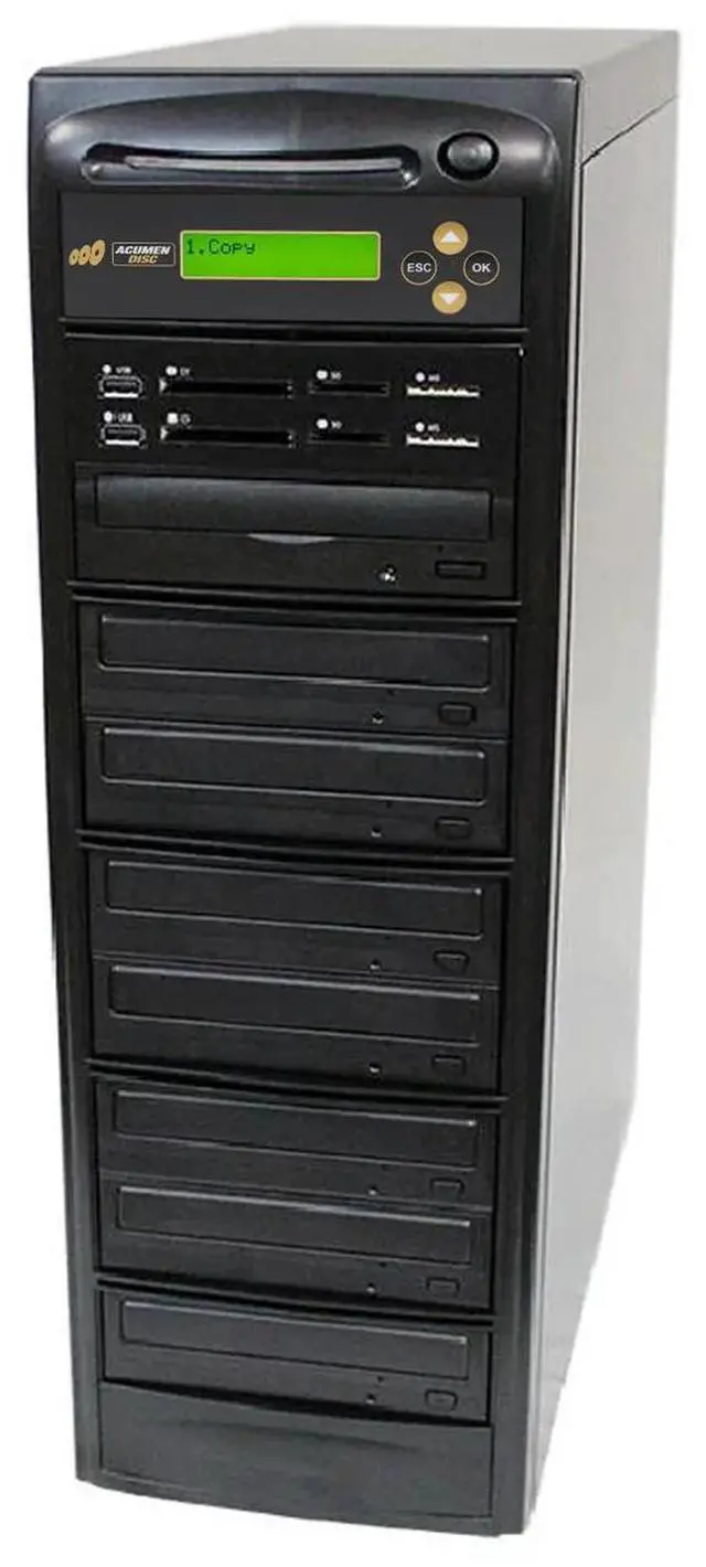 Besides being a disc to disc duplicator, you can use this complete system as an single target media duplicator to copy one USB, CF, SD or MS to the same or other type of media in the lower slot. There are 4 reader on the media deck that can be copy to the lower slot for this one to one copy media duplication (CompactFlash, Secure Digital, Memory Stick or USB at one at a time single target copy).