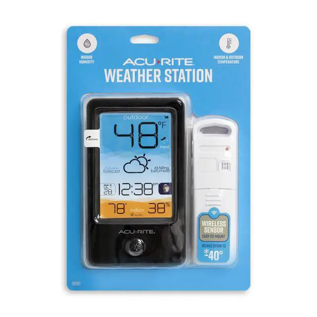 The AcuRite Vertical Color Weather Station with Hyperlocal Forecast, Indoor/Outdoor Temperature, Outdoor Humidity, Time/Date, and Moon Phase (00505) will boost your weather monitoring game! This weather station for home use utilizes patented self-calibrating technology to provide a hyperlocal forecast 12 hours from your current conditions pinpointed to your exact location. The backlit LCD screen depicts blue and sand colors with technology-forward rounded digits. The wireless outdoor sensor relays outdoor temperature measurements to the indoor weather station display, which also provides the indoor temperature and humidity, barometric pressure, the date and time, and the current moon phase. A perfect gift for Fathers Day, Christmas, or birthdays, the display can also show todays high and low records for outdoor temperature and indoor temperature and humidity. The internal Intelli-Time® clock automatically updates for daylight saving time and remembers the time in case of an accidental unplugging. The display operates with the included AC adapter and takes three AAA batteries for optional battery backup. The outdoor sensor features powerful wireless technology, a weather-resistant design, and an integrated hanger for easy mounting. This weather station comes with a one-year limited warranty.