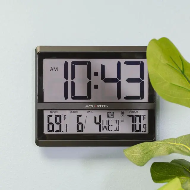 The AcuRite Large Wireless Atomic Clock with Indoor and Outdoor Temperature, Date, Day of the Week, and Automatic DST Changes (75440) is the perfect atomic clock for home use! It maintains time accuracy up to one second per million years! This 10.5-inch by 12.5-inch AcuRite atomic clock utilizes a built-in receiver to automatically pick up the National Institute of Standards and Technologies (NIST) radio signal from Fort Collins, Colorado. As a result, it displays and maintains exceptionally precise time and automatically updates each Spring and Fall for daylight saving time changes. The indoor clock has a built-in thermometer to measure and provide the indoor temperature, while an included outdoor wireless sensor thermometer takes the outdoor temperature and transmits that data to the indoor clock, which can display either degrees Fahrenheit or degrees Celsius. The large LCD display also provides todays date, month, and day of the week making for the perfect clock with calendar for any room within your home or business. The indoor LCD clock takes three AA batteries (not included), and the outdoor thermometer takes two AA batteries (not included), which results in a completely wireless thermometer clock. This AcuRite atomic clock is a perfect gift for Christmas, Fathers Day, or birthdays and comes with a one-year limited warranty.
