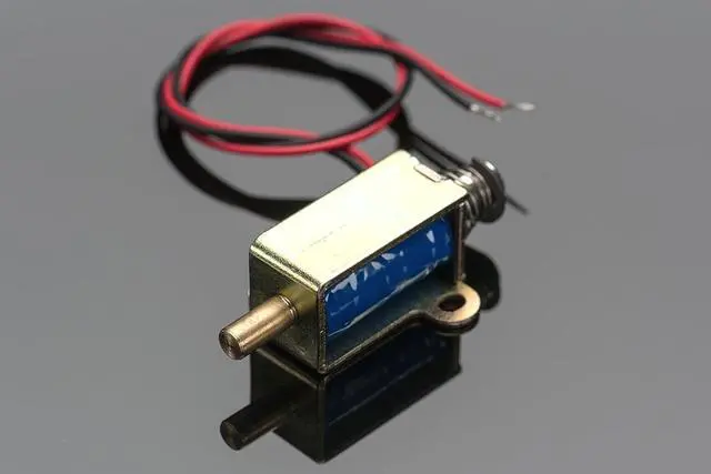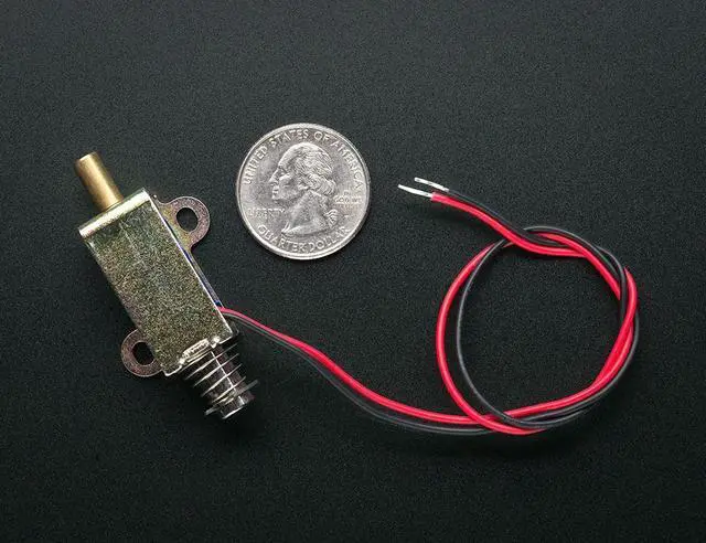 Solenoids are basically electromagnets: they are made of a big coil of copper wire with an armature (a slug of metal) in the middle. When the coil is energized, the slug is pulled into the center of the coil. This makes the solenoid able to pull (from one end) or push (from the other) This solenoid in particular is fairly small, with a 30mm long body and a 'captive' armature with a return spring. This means that when activated with up to 24VDC, the solenoid moves and then the voltage is removed it springs back to the original position, which is quite handy. Many lower cost solenoids are only push type or only pull type and may not have a captive armature (it'll fall out! ) or don't have a return spring. This one even has nice mounting tabs, its a great all-purpose solenoid. To drive a solenoid you will a power transistor and a diode, check this diagram for how to wire it to an Arduino or other microcontroller. You will need a fairly good power supply to drive a solenoid, as a lot of current will rush into the solenoid to charge up the electro-magnet, about 100mA, so don't try to power it with a 9V battery! Technical