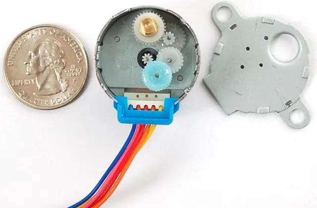 This is a great first stepper motor, good for small projects and experimenting with steppers. This uni-polar motor has a built in mounting plate with two mounting holes. There are only 32 step ( 11.25 degree) per revolution, and inside is a 1/16 reduction gear set. (Actually its 1/ 16.032 but for most purposes 1/16 is a good enough approximation) What this means is that there are really 32* 16.032 steps per revolution = 513 steps! The shaft is flattened so its easy to attach stuff to it with a set-screw. A perfect first stepper motor and works well with the Motor Shield for Arduino.