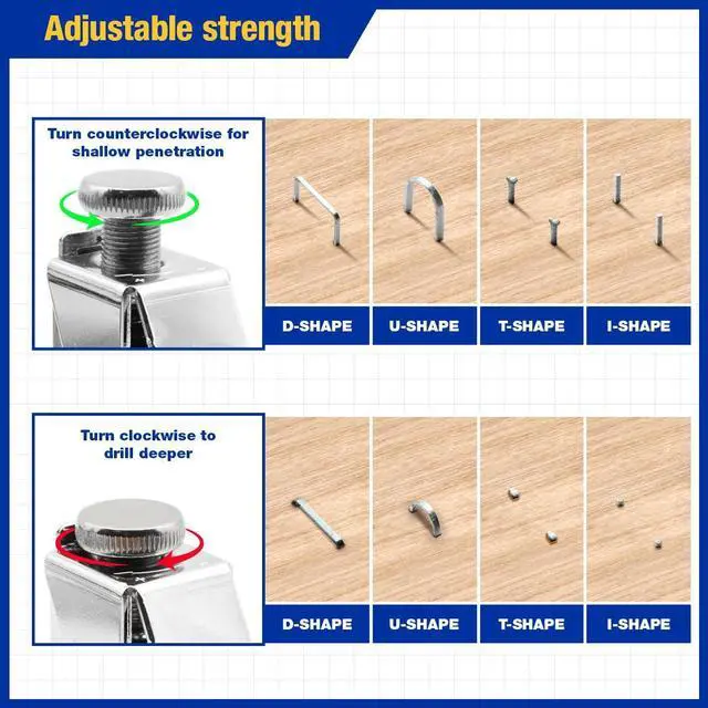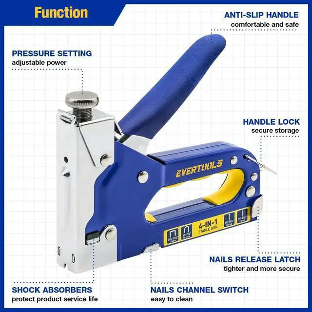 - Adjust the pressure to suit your needs. Perfect for Fixing material, Packing, Bookbinding, Decoration, Carpentry, Furniture, Doors and Windows, Wood, Billboards, House Wrap, Wiring, Flooring, Upholstery etc.