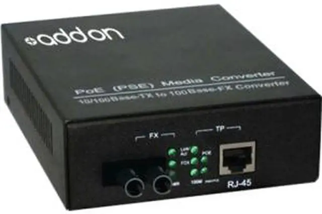 AddOn Network Upgrades ADD-FMCP-FX-ST is a Media Converter that converts a 100Base-TX(RJ45) to 100Base-FX(ST) via a 1310nm multi-mode fiber (MMF) ST connector, which allows distance reach up to 2km. ADD-FMCP-FX-ST provides a cost effective conversion from 100Base Copper to 100Base-FX fiber, while extending the network reach beyond the 100m reach limitation of copper. This AC/DC powered PoE media converter is a Power Sourcing Equipment (PSE) which combines data transferred over a fiber optic link with 48V (or other voltage) power supply, providing power to IEEE802.3af powered device (PD) over CAT5 UTP cable (cable length up to 100meters / 330feet). It complies with the IEEE802.3af standard. The converter includes a single port PSE controller, which offers PD signature sensing and power monitoring features. Other features include over-current protection and LFP function. The LFP (Link Fault Pass-through) allows the media converter to monitor both the fiber and copper RX port for loss of signal. In case of a loss of RX signal on one media port, the converter will automatically disable the TX signal to the other media port, thus passing through the link fault.