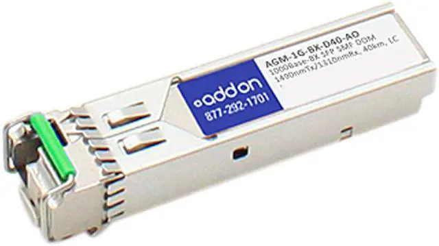 This Netgear compatible SFP transceiver provides 1000Base-BX throughput up to 40km over single-mode fiber (SMF) at a bidirectional wavelength of 1490nmTx/1310nmRx using a LC connector. Digital optical monitoring (DOM) support is also present to allow access to real-time operating parameters. Our transceiver is guaranteed to be 100% compatible with the equivalent Netgear transceiver. This easy to install, hot swappable transceiver has been programmed, uniquely serialized and data-traffic and application tested to ensure that it will initialize and perform identically. It is built to meet or exceed the specifications of Netgear, as well as to comply with multi-source agreement (MSA) standards to ensure seamless network integration. We stand behind the quality of our products and proudly offer a limited lifetime warranty. Trade Agreements Act (TAA) versions of this part are available upon request.