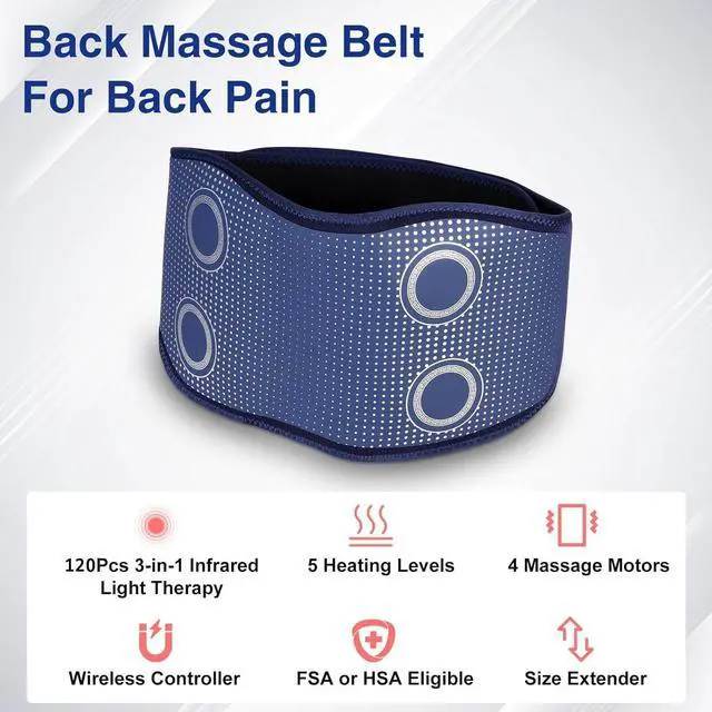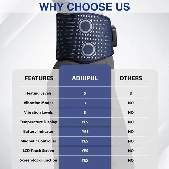 ADIUPUL back massager belt is a professional massage tool for muscle pain relief.Heating pad for back pain relief.It is not a Shiatsu massager and does not contain a kneading roller.Back massager for pain relief deep tissue.Equipped with 4 deep-tissue massage motors, it delivers relaxing massage to relieve muscle soreness, back pain, and tightness. With 5 heating levels and 3 intensity levels, this back massager can meet different needs. It features a red light therapy function, which can promote blood circulation and accelerate muscle recovery. The ADIUPUL back massager is designed with a soft and breathable fabric,making it comfortable to wear. The adjustable belt fits waist sizes from 27 to 46 inches.With a built-in 5000mAh battery, this back massager can be used for up to 3 hours after being fully charged for 2 hours. This cordless back massager is easy to use. Just turn it on and choose the mode and intensity you like. (heating pad for back pain relief cordless heating pad for back lower back massager with heat heating pad for lower back Cordless Heating Pad Lower Back Massager back pain relief products Heating Pad Back Brace with Heat and Massage Heated Back Massage ) Cordless Back Massager Belt,Red Light Therapy Massage Belt with 5 Heating Levels,3 Vibration Modes & Intensities,Lower Back Massager for Pain Relief Deep Tissue,4 Vibration Motors,Battery-Powered