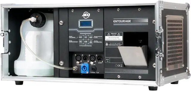 ADJ Entourage is a professional-grade faze machine built for high-demand applications. Featuring a powerful 1400W heater and a high-output fan system, it generates a consistent and fine atmospheric haze that enhances light beams without clouding visibility. Its intelligent design includes a built-in flight case for protection during transport and operation, making it tour-ready and stage-safe. The Entourage warms up in just 45 seconds, allowing for quick deployment. With a max output of 15,000 cubic feet per minute, it can easily fill large venues with high-quality haze using water-based fog fluids like ADJâ??s F4L Premium, F1L Premium, or F4L ECO. Control is intuitive with its built-in LCD screen and DMX compatibility, offering 1, 2, or 4-channel modes for full integration into lighting setups. Whether you need timed fog bursts, continuous flow, or manual control, the Entourage gives you complete command over the atmosphere. Additional professional touches include an external 5.6-liter tank for extended use and a locking PowerCon input for secure operation. The adjustable DMX In/Out ports (3-pin and 5-pin) ensure wide compatibility across lighting systems. Entourage Features