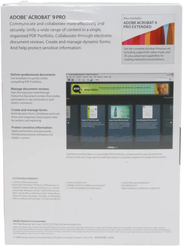 | Feature | Communicate and collaborate more effectively and securely. Unify a wide range of content in a single organized PDF Portfolio. Collaborate through electronic document reviews. Create and manage dynamic forms. And help protect sensitive information. Unify a wide range of content in a PDF Portfolio. Include FLV content in PDF files. Create and edit forms with the new Form Wizard. Take advantage of improved web capture and optical character recognition (OCR). Launch Acrobat faster. |