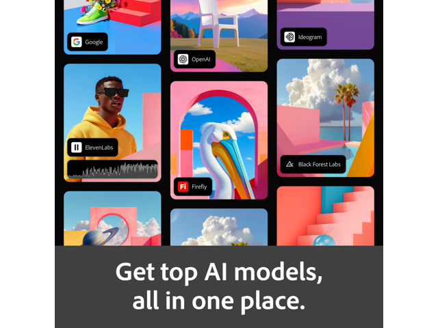 - Generate images, video, audio, and designs using top AI models from Adobe, Google, OpenAI, Runway, and more.
